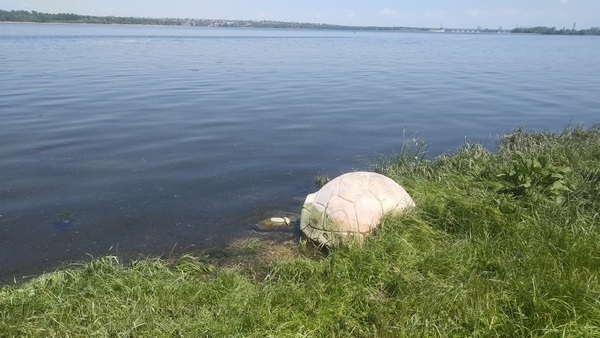 На фігурці черепахи на самому березі Дніпра стоїть в задумі високий сивочолий рибалка з вудочкою. Питаємо, як ловиться риба.
