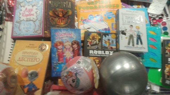Утім, серед персоналу впізнаємо працівників колишнього супермаркету. Та й деякі сліди від нього залишилися. Наприклад, куточок споживача або книжки й ігри для дітей. Вони виключно українські, хоча продукти в переважній більшості російського виробництва завозяться із Криму. Вартість продукції на цінниках вказана у гривнях і російських рублях за курсом 1:2. Утім, покупці розраховуються переважно лише гривнями.