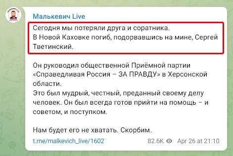 Чоловік не був членом окупаційної адміністрації Херсонської області, проте був тісно з нею пов'язаний. Як повідомляє у соціальній мережі підрозділ руху «За правду», Сергій Петрович Тветинський підірвався на міні. Інші обставини події наразі невідомі.