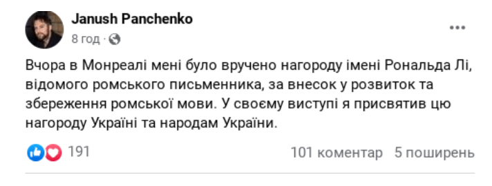 Про нагороду Януш Панченко повідомив на своїй фейсбук-сторінці.