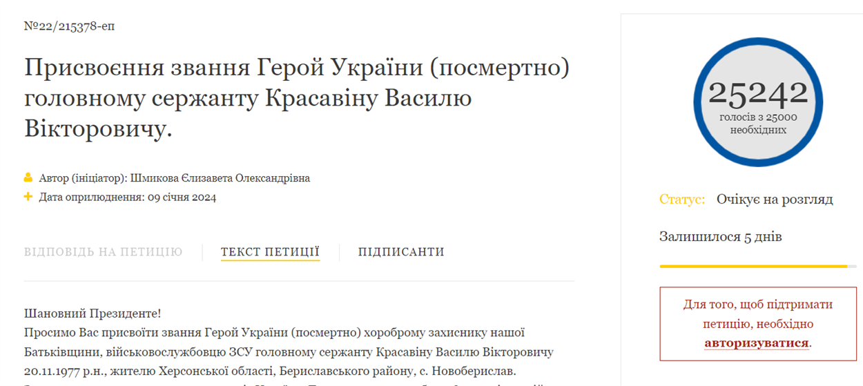 Петицію створила 19 березня 2024 року вдова загиблого Марія Задорожня. Поки що петиція набрала 11889 голосів із необхідних 25 тисяч. Залишилося 77 днів до закінчення збору підписів.