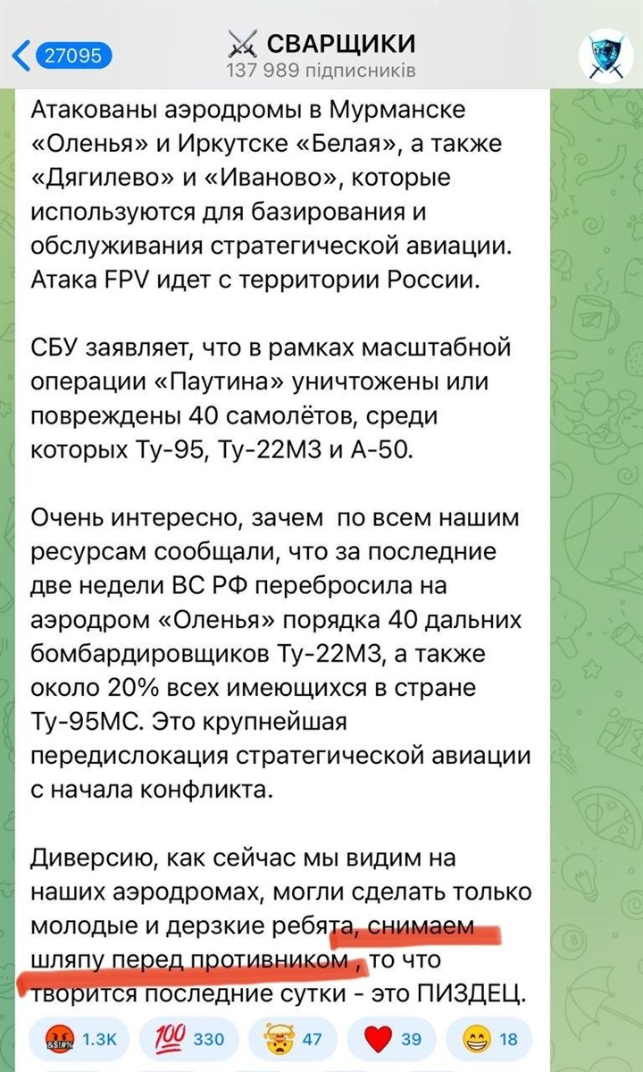 "Загалом йдеться про ураження 34% стратегічних носіїв крилатих ракет на основних аеродромах базування РФ. Це був не просто нищівний удар по ворожій авіації, а серйозний ляпас по могутності й терористичній сутності РФ", - розповів він.