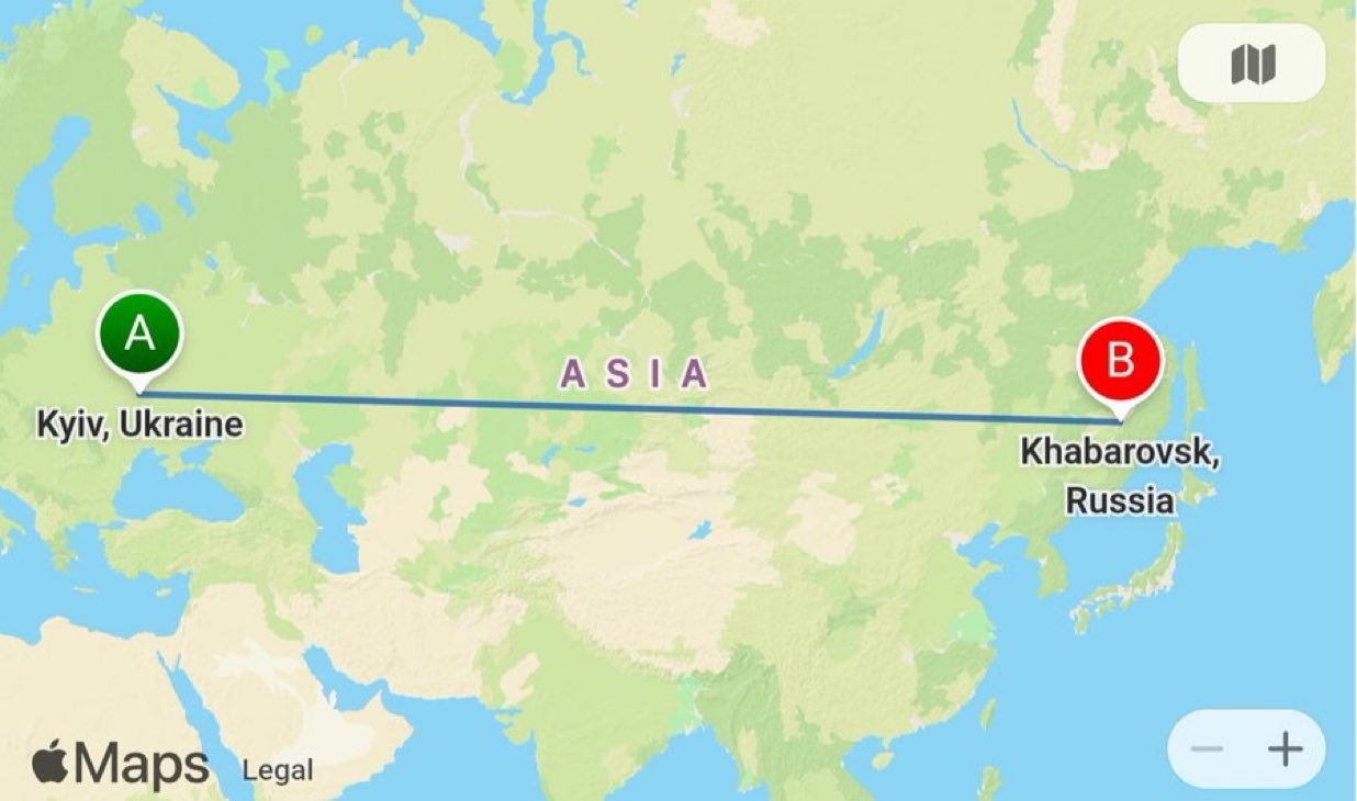 На Google maps бачимо, що відстань від України до місця спецоперації ГУР — близько 8 тис. км.