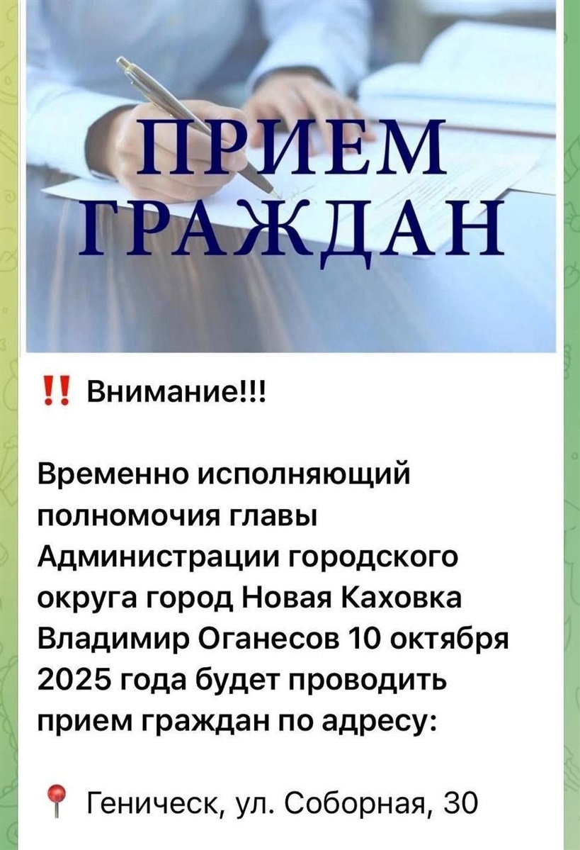 Новий гауляйтер міста Володимир Оганесов оголосив про проведення прийому жителів Нової Каховки з особистих питань. на 10 жовтня.