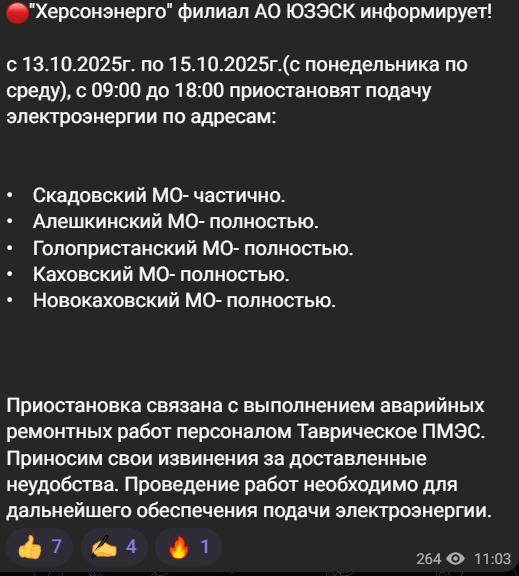 У зв’язку з цим відбудуться планові відключення електроенергії. Без світла залишаться: частина Скадовської громади, повністю Олешківська, Голопристанська, Каховська та Нова Каховка. Енергетики просять жителів завчасно підготуватися до відключень.