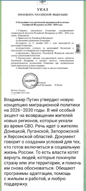 За словами російських ЗМІ, документ нібито спрямований на «повернення жителів нових регіонів, які виїхали під час СВО». Йдеться про жителів Донецької, Луганської, Запорізької та Херсонської областей.