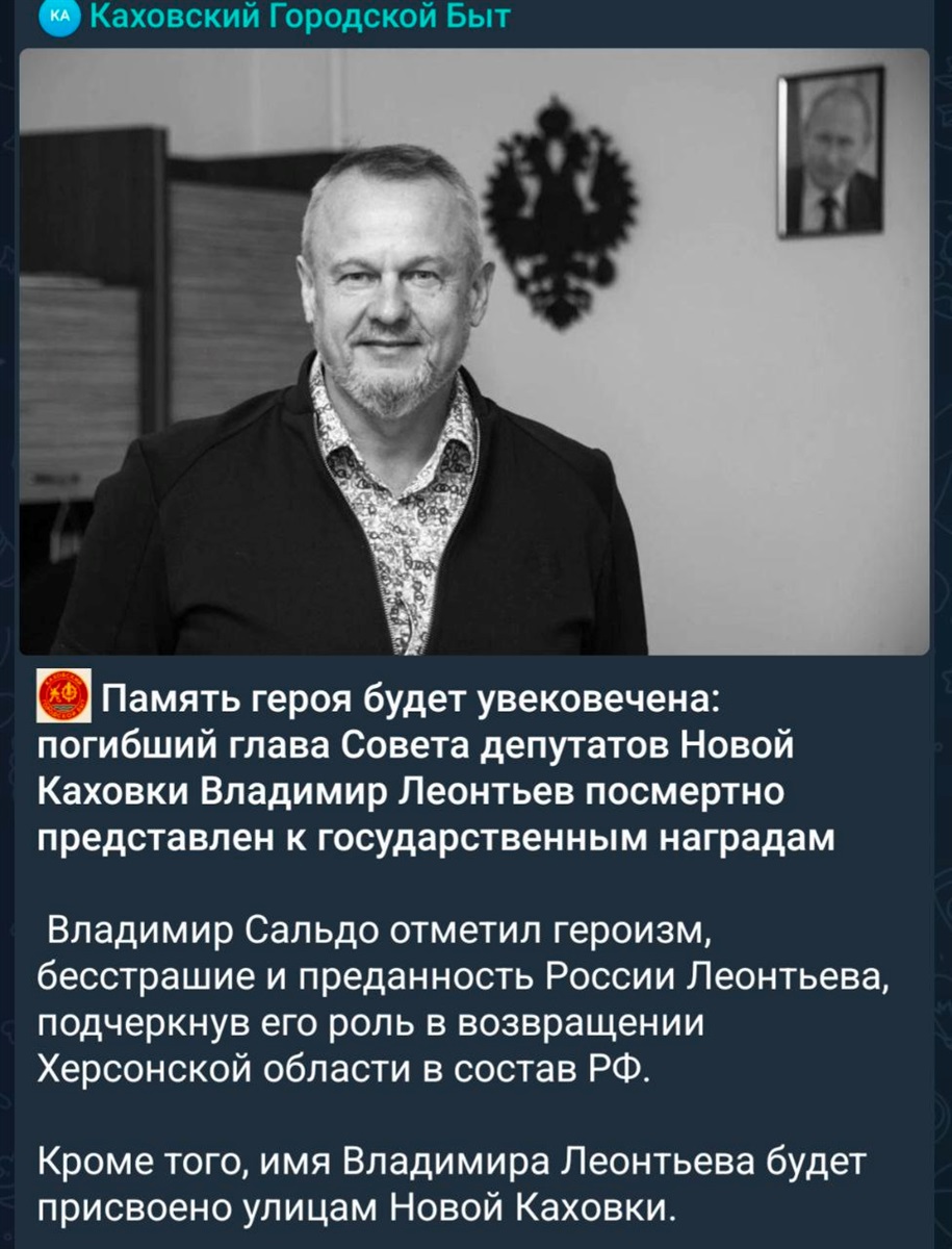 "Память героя будет увековечена: погибший глава Совета депутатов Новой Каховки Владимир Леонтьев посмертно представлен к государственным наградам .Владимир Сальдо отметил героизм, бесстрашие и преданность России Леонтьева, подчеркнув его роль в возвращении Херсонской области в состав РФ", - ідеться в повідомленні в одному з колаборантських телеграм-каналів.