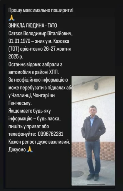 «Сатєєв Володимир Віталійович, 1 січня 1970 року народження, зник у Каховці орієнтовно 26-27 жовтня 2025 року. Відомо, що його забрали з автомобіля в районі місцевого хлібоприймального підприємства», – повідомили в соцмережах його рідні.