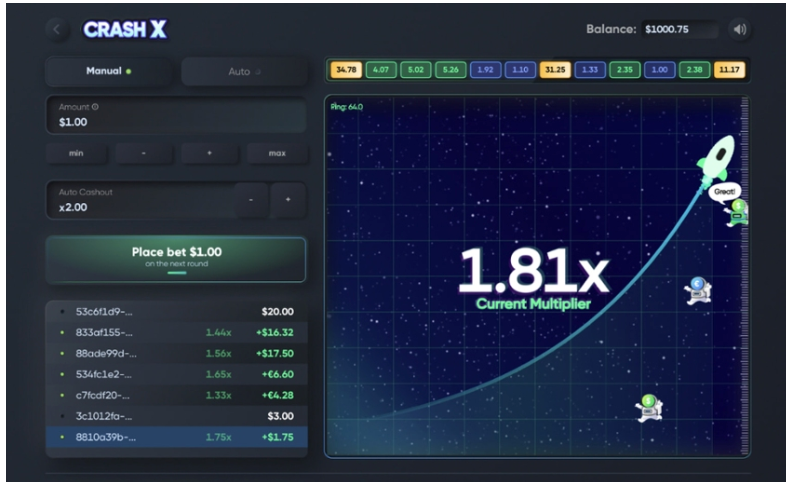 В основному, краш-ігри містять розділ для однієї або кількох ставок, більший розділ, де відображаються результати попередніх ігрових сесій, і екран, де фактично можна побачити, як множник ставки починає зростати все вище і вище.