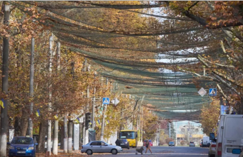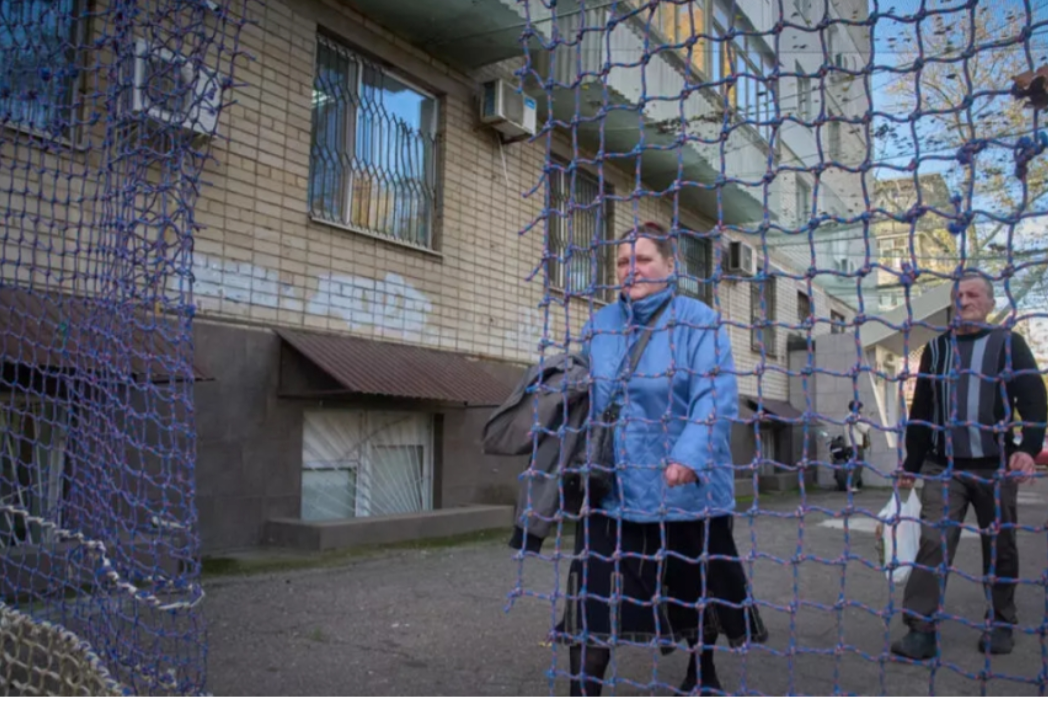 Сітки проти дронів FPV не лише натягнуті над вулицями, а й серед будинків. Йдучи на роботу чи школу, херсонці проходять фіранки у своїх дворах.