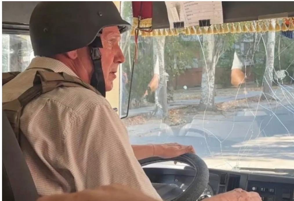 Попри обстріл водії продовжують возити херсонців міськими маршрутами — деякі надягають захисні каски та бронежилети. Цей автобус вже постраждав від росіян.