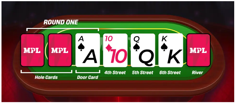 Друга вулиця: Кожному гравцеві роздається по три карти: дві обличчям донизу (так звані закриті карти або hole-cards) та одна карта обличчям догори (так звана дверна карта або door card).
