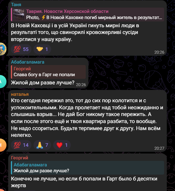 Але жителі зауважують, що обстріли в регіоні останнім часом активізувалися. Так, у Каховці та Тополівці поранено мирних жителів, у ряді сіл пошкоджено будинки та техніку. Окупаційно влада написала, що в Новій Каховці внаслідок обстрілів загинув чоловік. Однак в коментарях люди зауважують, що загиблих і поранених чимало.