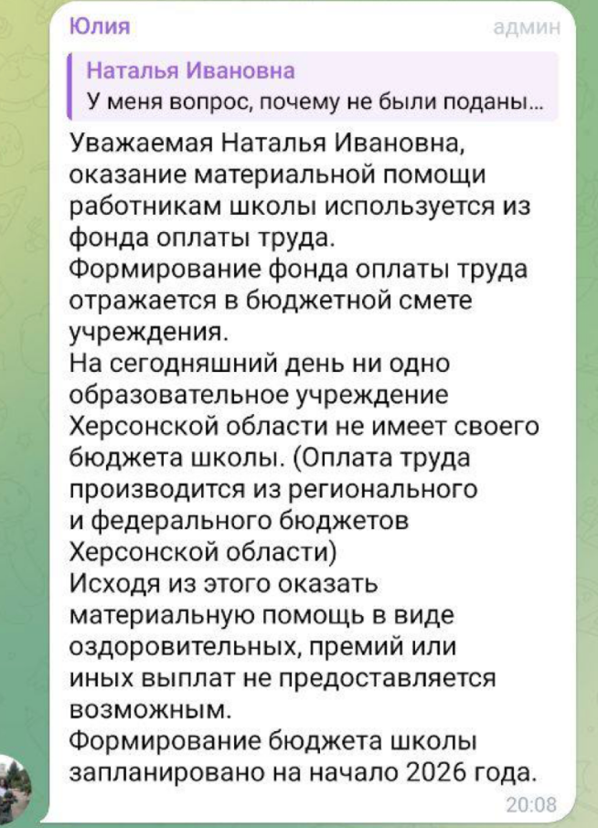Окупаційна школа №10 Нової Каховки, по суті, не працює з осені 2022 року. Проте цей заклад має штат працівників. В окупаційних пабліках можна зустріти скарги останніх на Юлію Тютюрятник – її звинувачували у невиплаті так званим освітянам оздоровчих у 2025 році. Причому, у своїй відповіді Тютюрятник пояснила це тим, що нібито всі освітяни окупаційних шкіл Херсонщини не отримують від російських загарбників оздоровчих, премій та інших виплат.
