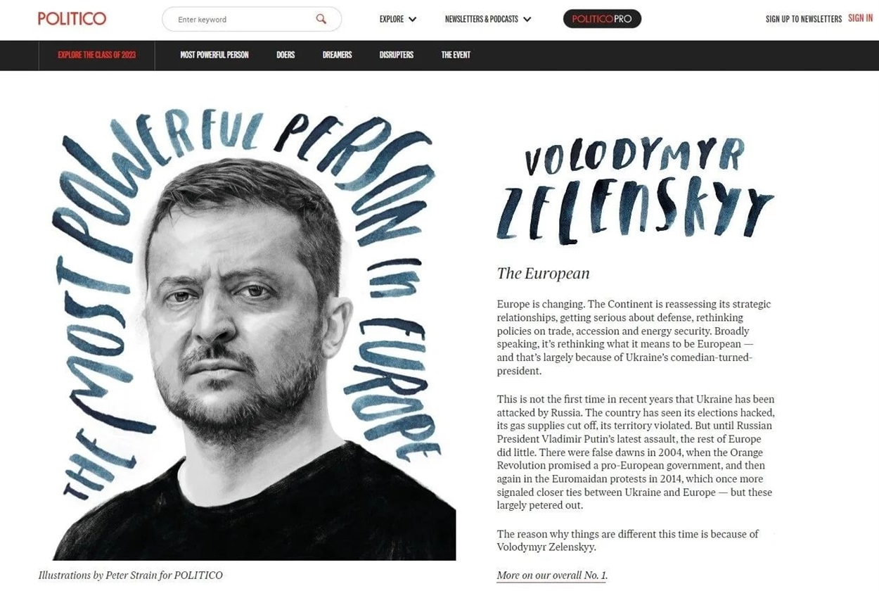 2022 року Зеленський очолив рейтинг найвпливовіших людей Європи від видання POLITICO. Учасники голосування описували українського президента як «маяк надії», який прагне «миру, демократії та порядності».