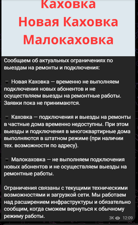 ▪️ Каховка — підключення та виїзди на ремонт у приватні будинки тимчасово недоступні. При цьому виїзди та підключення до багатоквартирних будинків виконуються в штатному режимі (за наявності тех. можливості за адресою).