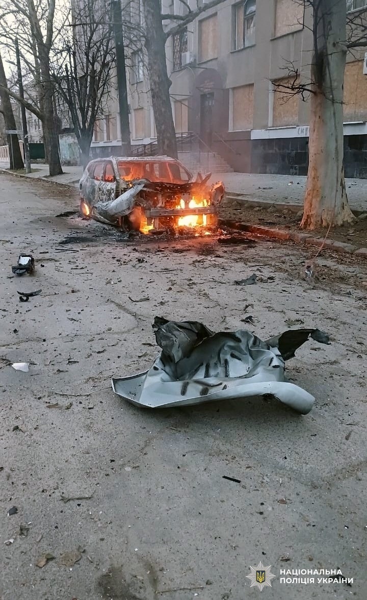 У Центральному районі російський FPV-дрон атакував службовий автомобіль поліції. Отримав поранення 48-річний поліцейський. У нього діагностували вибухову та черепно-мозкову травми, контузію й уламкове поранення голови. Транспортний засіб вигорів вщент. В результаті інших атак пошкоджено два цивільні автомобілі. Ще одну автівку пошкоджено через скид вибухівки з БпЛА.