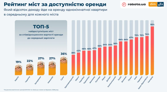 Найбільшу частку від зарплати "з'їдає" оренда в Ужгороді — 92%. Мешканцю столиці в середньому потрібно віддавати 72% від місячного доходу на житло, у Львові — 64%, у Дніпрі — 54%, в Одесі — 42%, повідомляють аналітики.